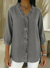 No es solo una blusa… es esa prenda que te pones cuando quieres verte bien sin complicarte 💫 Marina combina la suavidad del denim ligero con un delicado escote con volantes que aporta ese toque femenino que marca la diferencia.